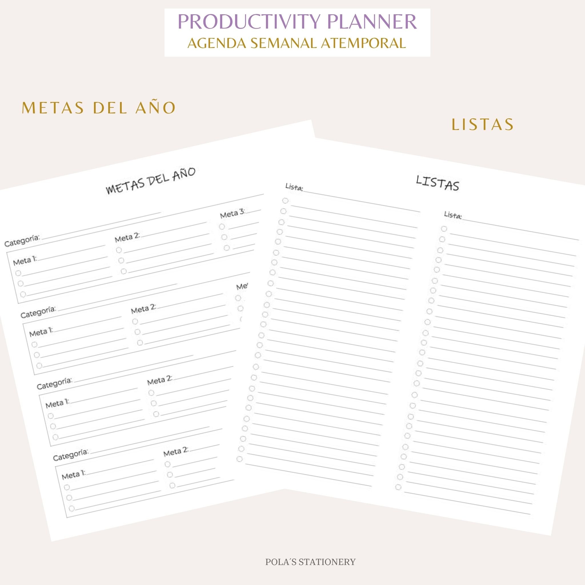 El Productivity Planner  se adapta a ti. Es sin fechas, puedes comenzar a usarlo en cualquier momento del año y también solo cuando lo necesites. A tu propio ritmo, sin fechas que te exijan, sin culpas si te detienes. Si dejas de usarlo, puedes retomarlo donde lo dejaste sin perder hojitas.